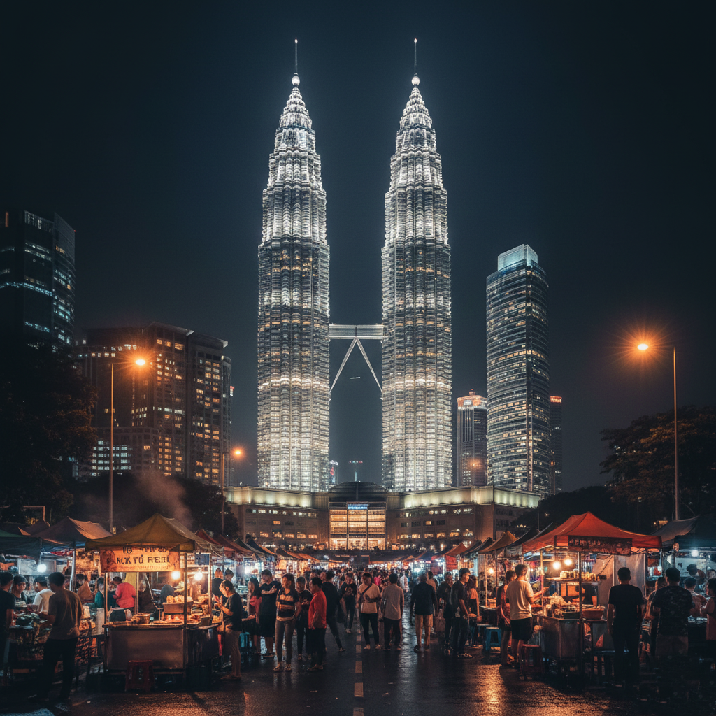 Petronas glow night skyline. Chinatown street food Jalan Alor hawker heaven. Batu Caves monkeys cable car. Modern Malay fusion flavors cheap stays.