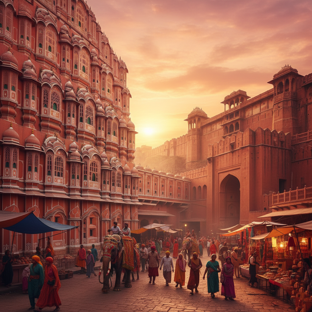 Rajasthan royalty Hawa Mahal Amber Fort elephant rides. Street chaat block printing shops. Haveli stays colorful chaos. Fort nights elephant bless vibes unreal.