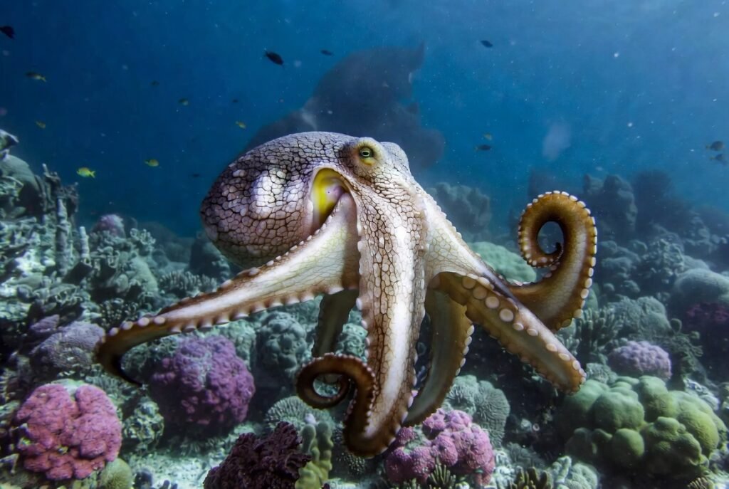 Three hearts assisted octopuses to survive in the deep and often cold waters. The gills are pumped by two hearts, and the remaining part of the body is pumped by the third. They have blue blood due to the copper rather than the iron contained in their blood.