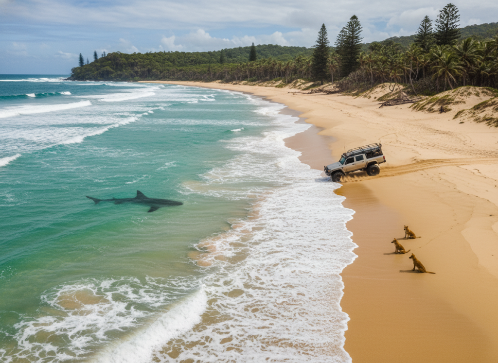 Nothing sits still here. The water pulls, sharks pass close, dingoes watch like curious kids. Even the sand shifts under cars. It is beautiful but restless, like a place that never lets you fully relax.