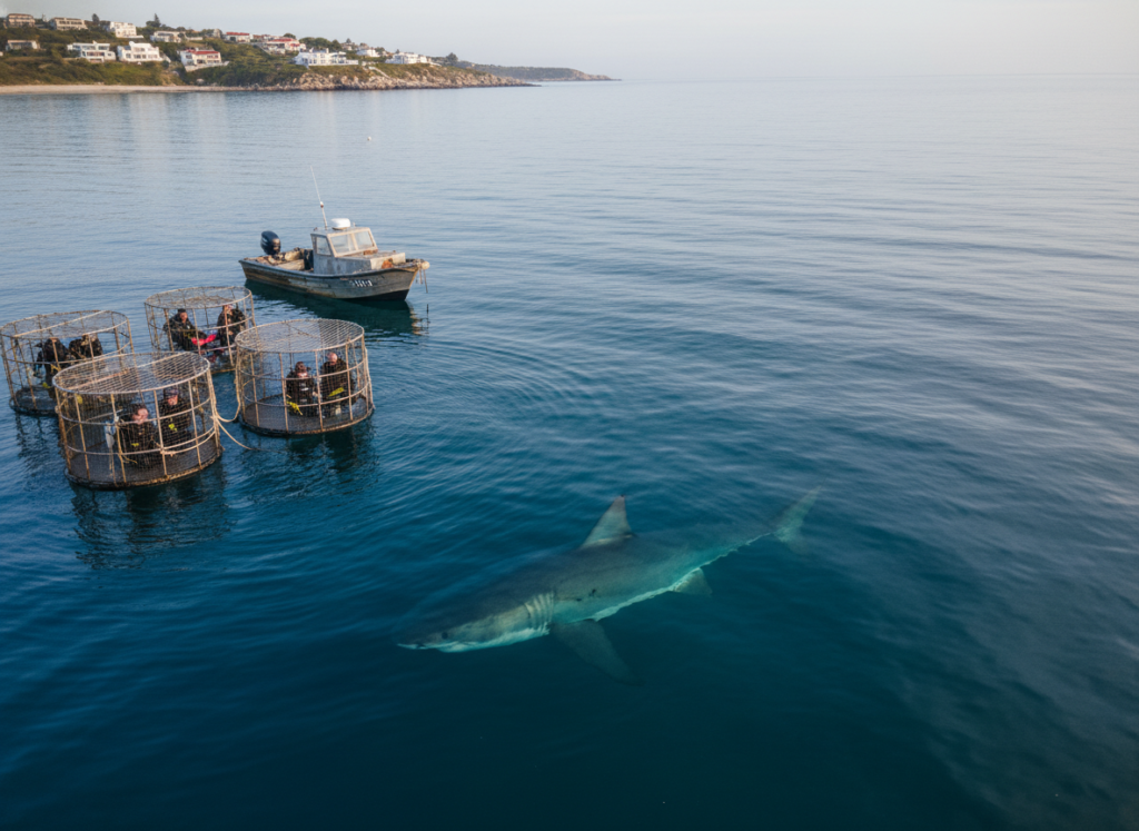 The ocean looks quiet, almost polite. Then you remember this is where great white sharks live. People float in cages nearby, half smiling. The danger is not loud. It is patient and confident.