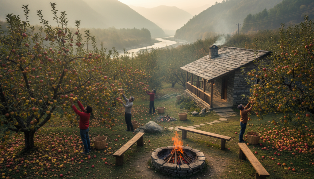 October picks in Kotgarh or Tirthan Valley. Pluck your own, sip cider by firepits. Treks gentle, rivers sing lullabies. City stress melts in mist.