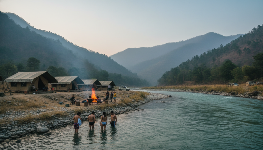 Rishikesh rafting lite, then Jim Corbett tiger safaris from tents. Morning Ganga dips, evening bonfires. Wildlife thrills minus jungle hacks.