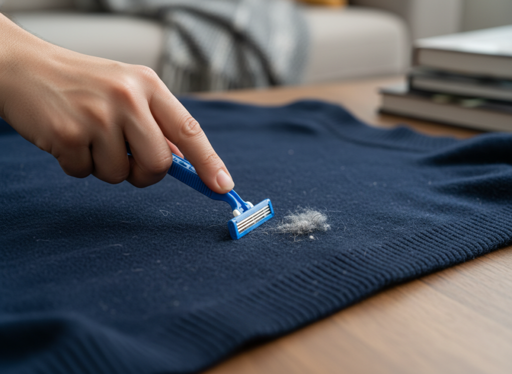 A clean and sharp disposable razor is one of the easiest ways to shave off those stubborn pills from flat fabrics. Just pull the fabric tight and use short light strokes to gently scrape the fuzz away without cutting into the threads.