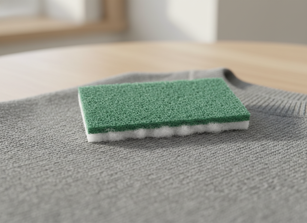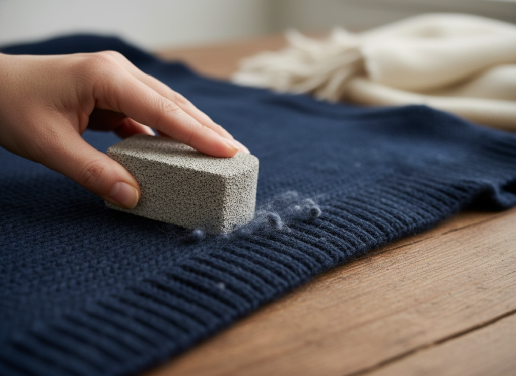 A brand new and dry green scouring pad from your kitchen can actually work wonders on pills if you are very gentle. Lightly brush the surface in one direction and the abrasive side will catch the lint while leaving the smooth fabric alone.