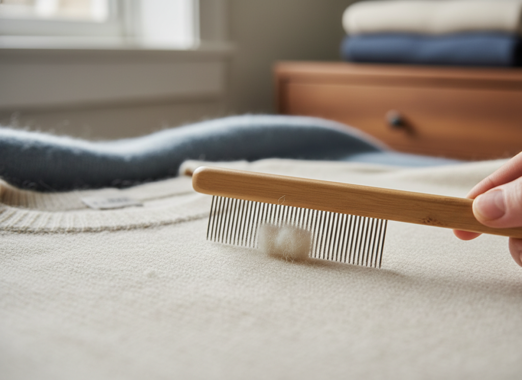 If you have a fine-tooth comb or even a special sweater comb you can gently run it over the surface of the knit. The tiny teeth catch the little balls of lint and lift them away which works great for more delicate items like cashmere.