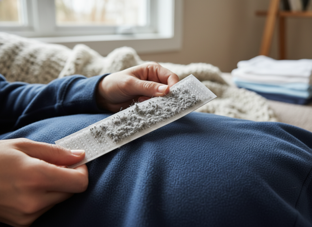Use the scratchy side of a Velcro strip to pull fuzz off tough clothes like fleece. Don’t do this on thin shirts though, because the Velcro might pull a thread and ruin everything.