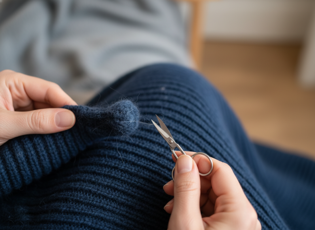 Got big lint balls? Just snip them with embroidery scissors. It takes a bit more work but you won’t pull on the strings and cause a giant mess or rip a hole in it.